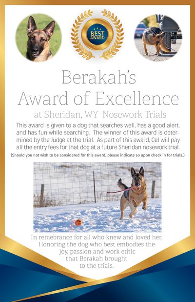 This is a special award that will be given to someone at a Sheridan Wyoming RMDS Nosework Trial. The Judge will choose a dog that searches well, has a good alert, and has fun searching. Cel Hope will pay all entry fees for that dog at a future Sheridan - RMDS sponsored nosework trial.